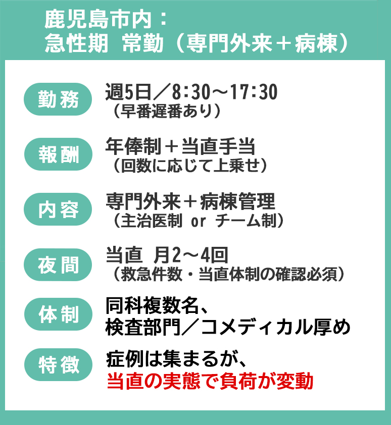 • 鹿児島市内急性期・専門外来・当直ありの求人が集まりやすい