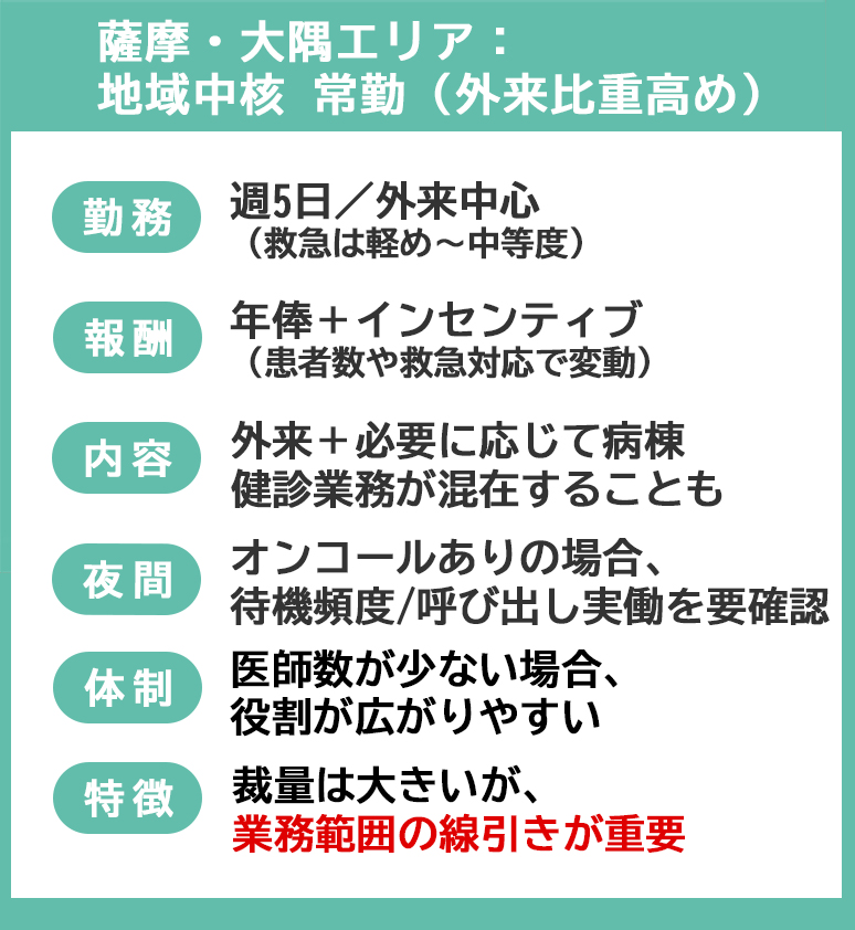 • 大隅(鹿屋など):人員体制次第で、役割が広くなりやすい
